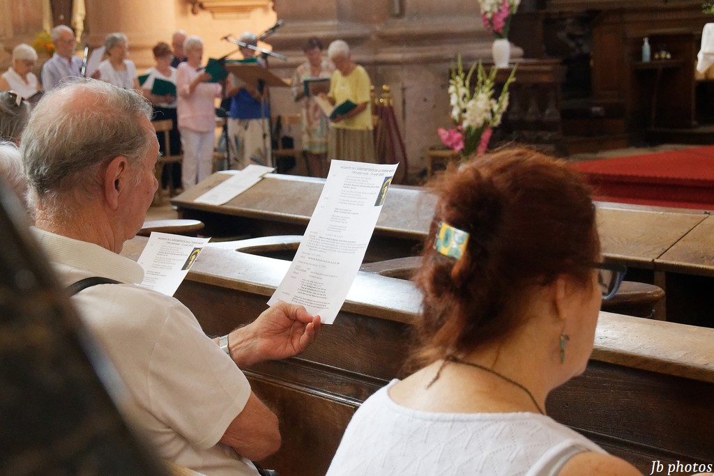Vendredi 15 août l’église Notre Dame c’est remplie de paroissiens, ainsi que de touristes de passage ! D’ailleurs un couple Allemand de la région de Munich y était » Nous avons été émerveillé par cette célébration, par la chorale, et l’organiste , un vrai régal , j’ai d’ailleurs fondu en larme lors de l’ Avé Maria « (Glöcklein) nous a précisé la femme du couple. Cette messe a été célébrée par notre curé Norbert Wegscheider, rehaussée par un programme de chants riches et variés de la chorale St Cécile sous la direction de son chef de chœur Paul Mettling, ainsi que de l’organiste Sorel Hirtz. Les paroissiens ont ensuite été conviés au verre de l’amitié par le conseil de Fabrique, dans la cour du presbytère Notre Dame. Les autres photos ICI