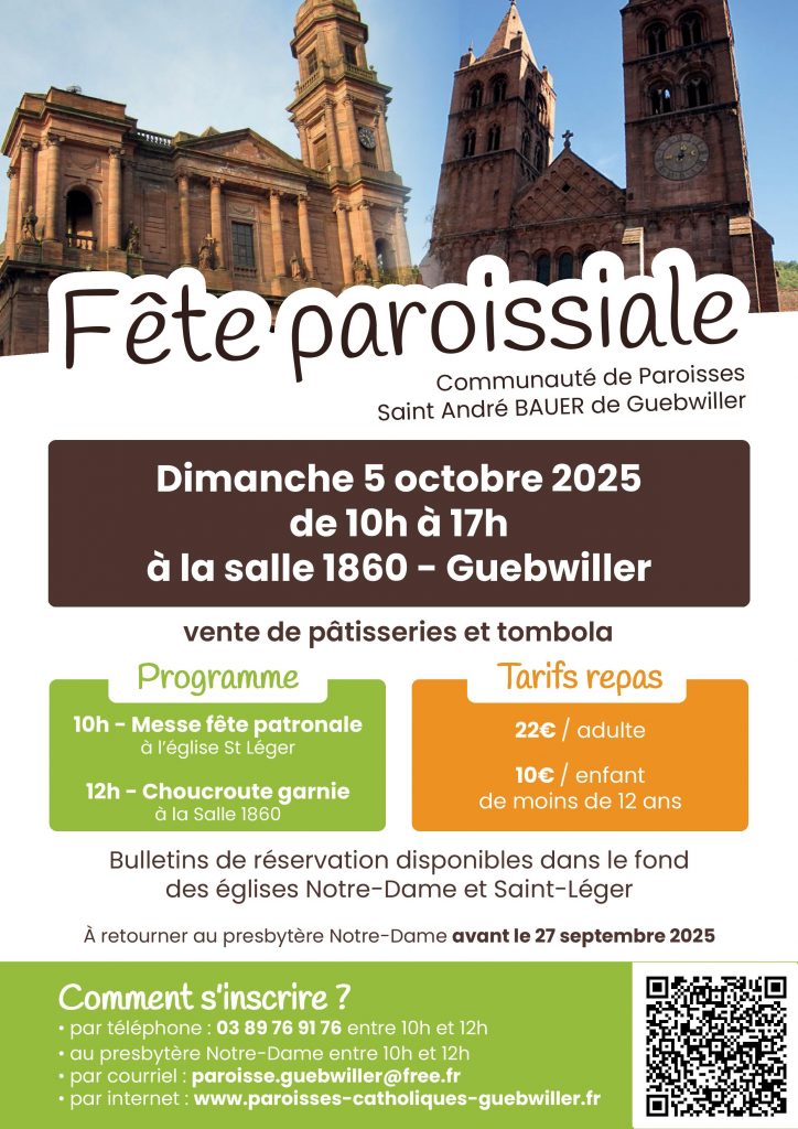 Chers frères et sœurs, chers amis Dimanche 5 octobre 2025 se tiendra la fête paroissiale annuelle de la communauté de paroisses Saint André Bauer. Comme chaque année, nous nous retrouverons aux alentours de midi, salle de la société de gymnastique 1860 à Guebwiller pour partager la traditionnelle choucroute autour de notre curé le père Norbert. Oui mes amis ! Comme l’aurait si bien dit Roger SIFFERT, « Osons la choucroute », osons l’amitié, osons la solidarité, osons être ensemble et osons nous ouvrir aux autres, autant de critères d’une liste qui n’est pas exhaustive mais qui peut tout aussi bien nous aider à mieux affronter notre monde souvent si brutal, qu’à passer simplement un bon moment ensemble. Alors, retrouvons-nous le dimanche 5 octobre 2025 pour ce traditionnel moment d’amitié et de fraternité.