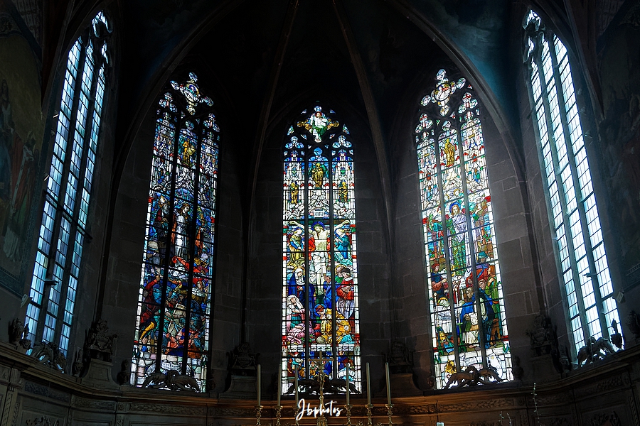 Les vitraux dans le chœur de l’église St Léger (réalisés par les frères Ott selon des dessins réalisés en 1922 par René Kuder)