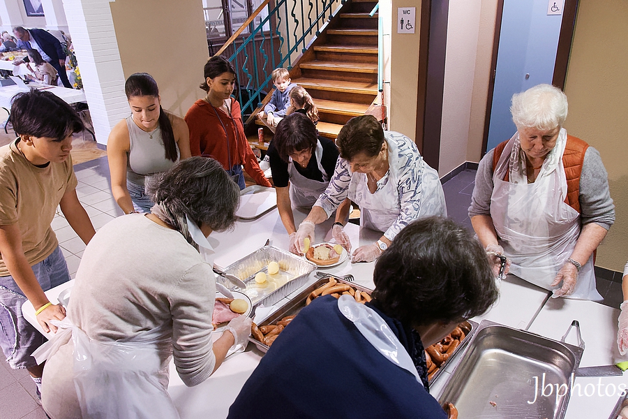 A l’issue de cette cérémonie, animée de main de maître par la chorale, tout le monde s’est retrouvé à la Salle Municipale SG 1860 de Guebwiller, fraîchement rénovée, pour déguster la traditionnelle choucroute, dont les bénéfices serviront à l’entretien des deux églises et de leurs dépendances. Ce sont ainsi 180 repas qui ont été servis par une efficace équipe de bénévoles, tout cela dans une ambiance chaleureuse et confraternelle, en présence notamment de Messieurs Kleitz et Muller, respectivement maire et premier adjoint de Guebwiller et du pasteur Roland KAUFFMAN. A l’instar de la récolte des différents cépages, le « cru » 2025 de cette fête si importante pour la communauté catholique s’est révélé excellent. Le défi est lancé pour 2026 et vous pouvez déjà réserver la date du 04 octobre 2026.