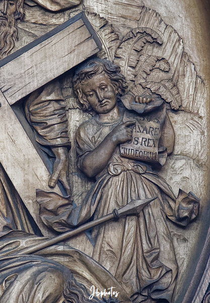 Jésus est cloué sur la croix. Les soldats romains à cheval montent la garde. Un Juif tient derrière lui le texte qui sera cloué sur la croix.