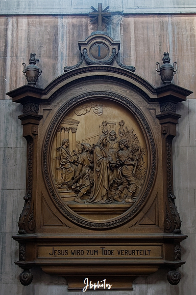 Jésus est condamné à mort. Cette station est située dans la chapelle du Saint Sacrement, Un femme verse de l’eau sur les mains de Pilate. Une fleur de la Passion annonce l’évènement…